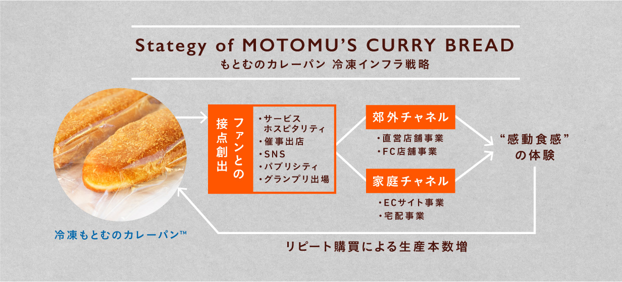 もとむのカレーパンのマーケティング活動は、ブランド理念である「一口目の感動」を追求し、そこから逆算しています。熱々で薫り高いカレーを一口目から食べられるよう、いかなるシチュエーションでも“感動食感”を体験していただけます。また、“感動食感”をより印象深くするために、カスタマージャーニーの入口となるファン(顧客)との接点には、細心の注意を払っており、ブランドの世界観を伝え、ファンの共感を生むことに尽力しています。